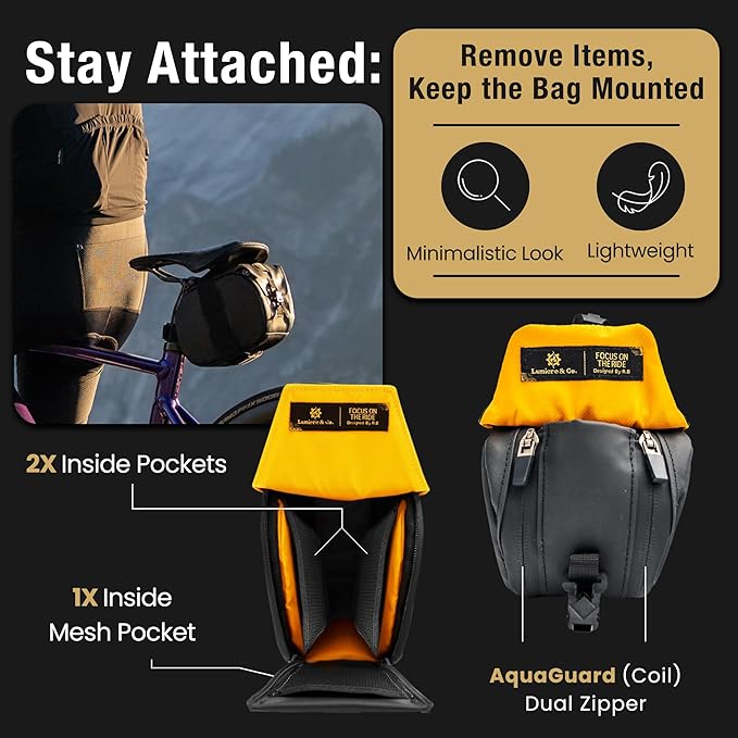 Lumiere & Co. Maximus Magnetic Bike Seat Bag – Quick-Attach Saddle Bag with AquaGuard Zippers, Secure Under-Seat Storage for Cycling Gear & Accessories (Black, Small)