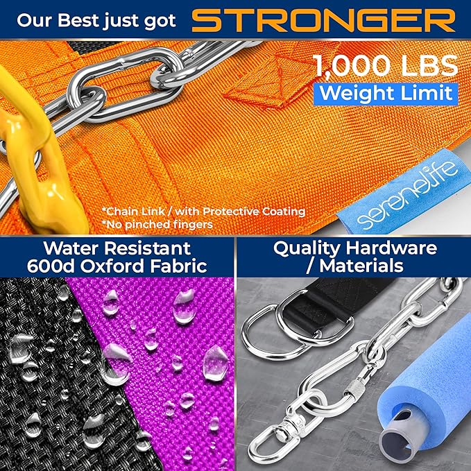 - SUPPORTS UP TO 700 LBS: Safety is key, with the outdoor swing boasting a weight capacity of up to 700 lbs. Get 360-degree spinning excitement with the swivel attachment. A soft pillow adds comfort, secured by hook-and-loop fasteners for stability.