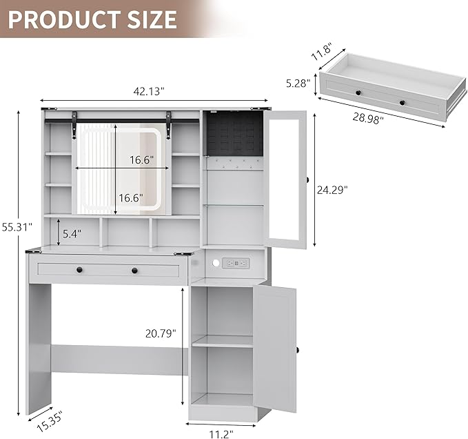- 【Farmhouse Style with Sliding Mirror】The dressing table has a unique appearance and structure, barn-door decor design for added farmhouse charm and elegance. The HD sliding vanity mirror allows you to use it on the left/right side of the vanity desk