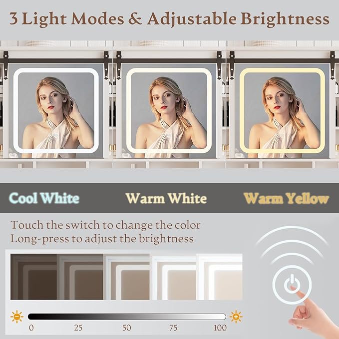 - 【3 Lighting Modes & Brightness Adjustable】This make up vanity features a large LED mirror with 3 color modes (warm; natural; cool), which is safer than ordinary light bulbs. You can change the color mode by pressing the touch switch, or adjust the brightness by long-pressing the touch switch