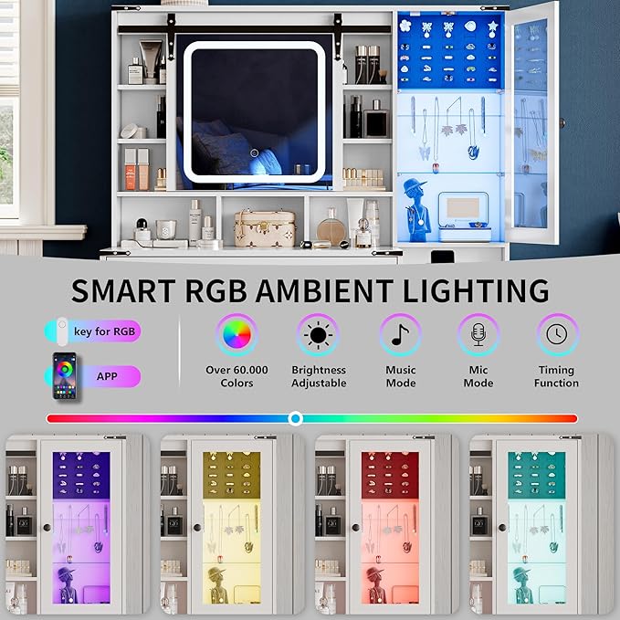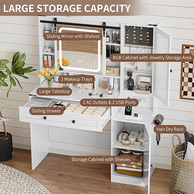 Makeup Vanity Desk with Sliding Mirror and Lights, Farmhouse Vanity Table Set with Power Outlet & RGB Cabinet, Dressing Table with Storage Drawers & Shelves for Kids Girls Women Bedroom, White