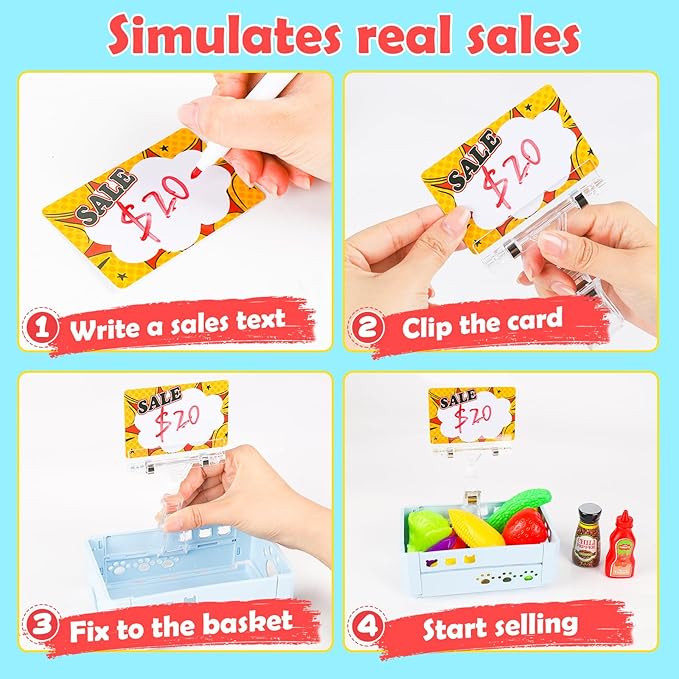 - Enhanced Playability: We've specially designed a creative price board kit. Kids can write product prices or promotional details on the sale boards, simulating real-life shopping and supermarket management scenarios. Kids can select items, place them in the shopping cart, and pay with play money. This not only adds fun to the game but also helps children better understand the shopping process and the concept of money