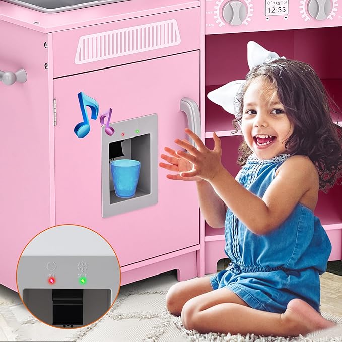 JOYLDIAS Kids Play Kitchen,Corner Wooden Pretend Toddler Kitchen Toys Playset with Realistic Lights & Sounds,Microwave Oven,Water Dispenser, Phone, Sink,Cooking Accessories, for Ages 3+, Pink