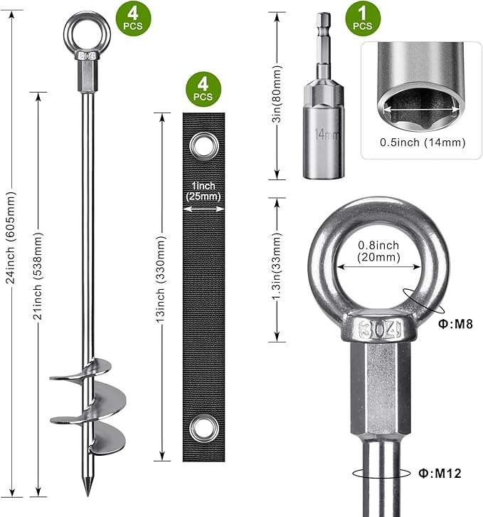 - π«πππππππππ: Total length of trampoline stakes is 24'', anchor length is 21'', solid 12mm diameter steel, fully welded spiral diameter is 3", comes with strap, socket and screws.