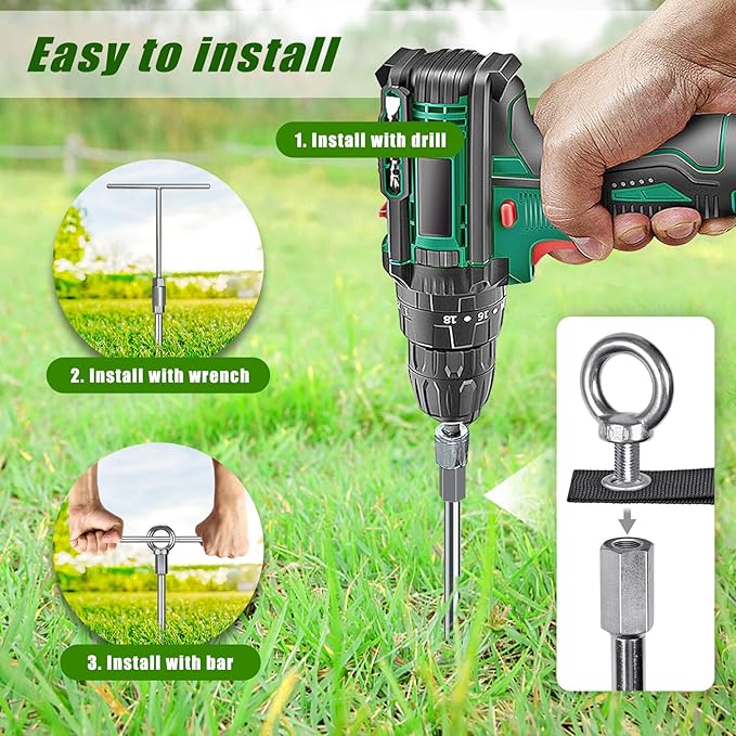 - π¬πππ π°πππππππππππ: Featuring a screw-in design, these trampoline anchors high wind heavy duty can be installed in a variety of ways: 1> Easy to use with an electric drill, saving time and labour; 2> Use manually: Screw in with a T-wrench or rod. 3'' wider spiral ensure a secure hold in the ground.