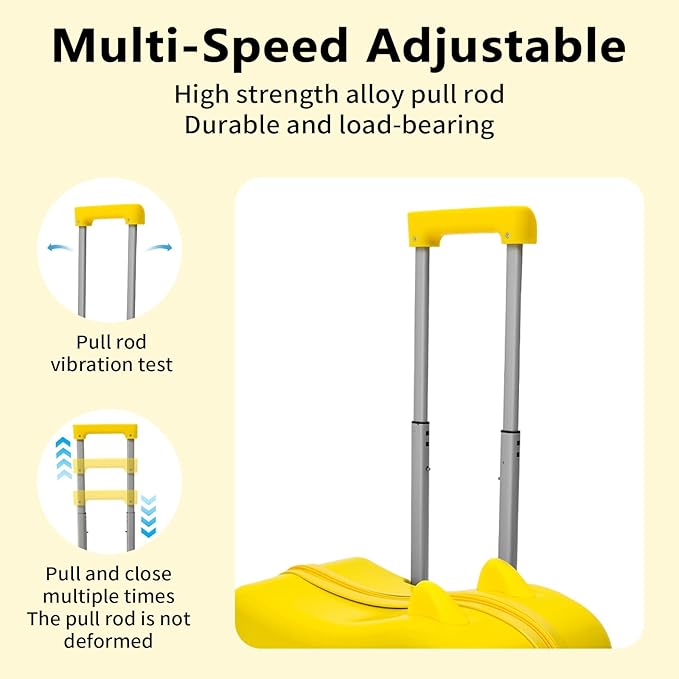 - 【Enjoy the ride】: High-quality 3-layer PVC construction with moderate hardness and weight capacity up to 110.23-132.28 pounds for your child to ride on, four silent universal wheels combined with height-adjustable trolley bar (about 26.38 inches and 33.46 inches) make this child’s riding suitcase move more easily and smoothly.