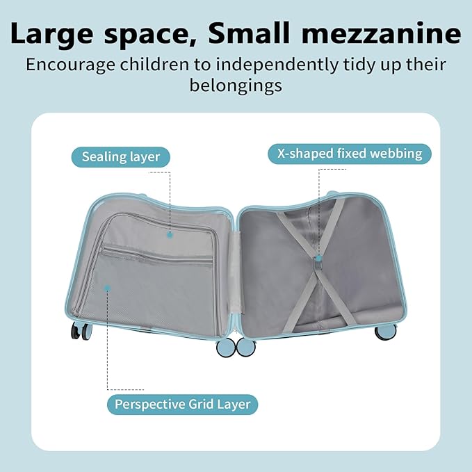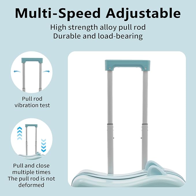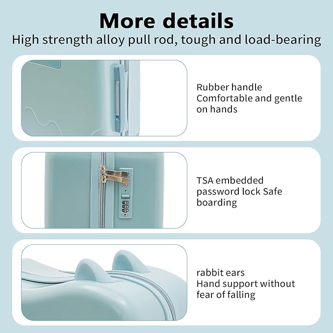 - 【Humanization design】: The suitcase is equipped with a built-in combination lock, four silent universal wheels with height-adjustable trolley bar (about 26.38 inches and 33.46 inches), the top of the concave curve design is more in line with the human body structure, combined with rubber grips, so that the child rides on the top of a more comfortable, safer, less likely to fall.
