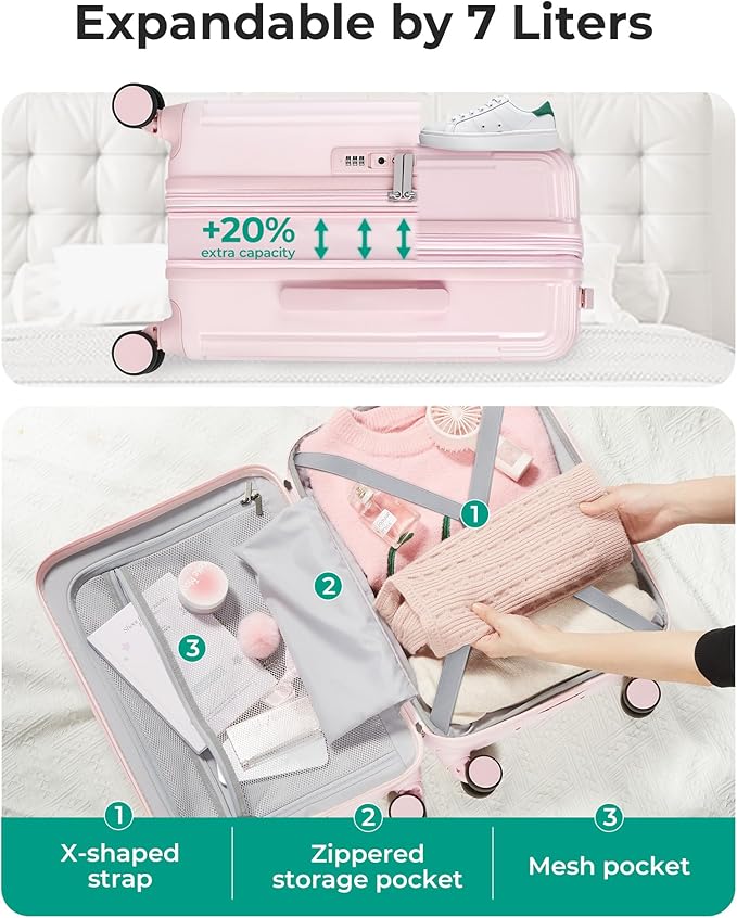 - Effortlessly expand with 20% more space: The carry on luggage comes with two extra-large main compartments, featuring smooth mesh zipper panels and straps to secure your belongings perfectly. It includes two zippered mesh pockets for quick access to essentials and an internal pocket for storing small items. The expandable zipper function adds 1.6 inches of extra space, allowing you to feel at ease.The carry on suitcase offers an additional 7L of space, boasting an impressive capacity of 42L.