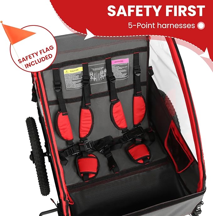 - Comfort and Sturdiness: The child bike trailer has two high-quality 5-point seat belt systems and ergonomic seats to keep your child safe and secure. Additionally, 16-inch inflatable rubber tires provide cushioning and a smooth ride