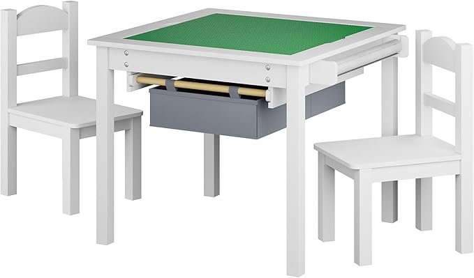 Treocho Wooden Kids Table and Chair Set with Reversible Tabletop, 2 in 1 Toddler Desk with Storage Drawers, Kids Activity Table with Blocks Building Baseplate for Playing, Reading, Drawing, White