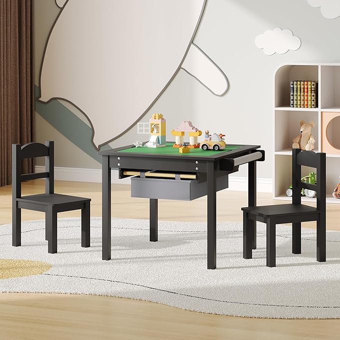 Treocho Wooden Kids Table and Chair Set with Reversible Tabletop, 2 in 1 Toddler Desk with Storage Drawers, Kids Activity Table with Blocks Building Baseplate for Playing, Reading, Drawing, Black