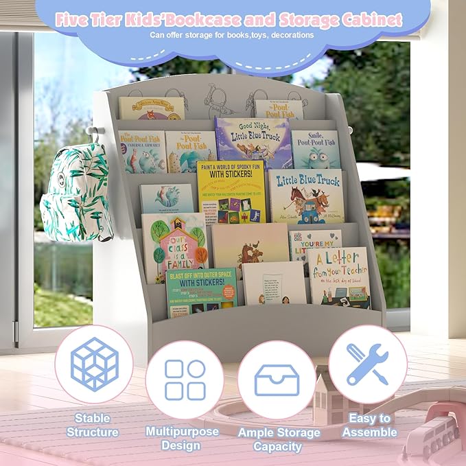 - 【FIVE-TIER ORGANIZATION BOOKSHELF】 : This children's bookshelf boasts 5 open spacious front facing child shelves, perfect for organizing 30 books or more, story books, toys, educational materials, it encourages a tidy and well-arranged personal library for your little one.Great way to save space while displaying books.🎯