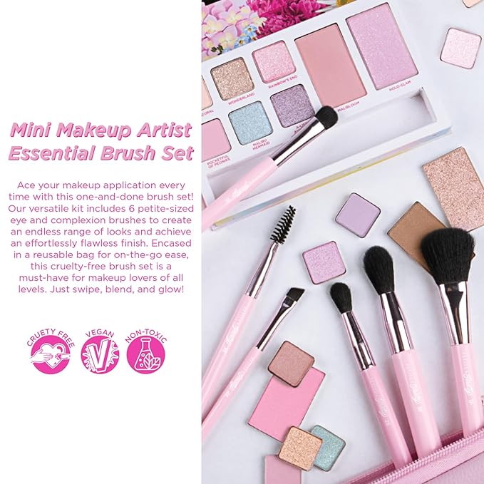 Petite N Pretty Essential Eyeshadow Brush Set with Duck Clips - Pink Makeup Bag, 6 Artist Brushes & Hair Accessories for Girls, Kids, Teens, and Tweens