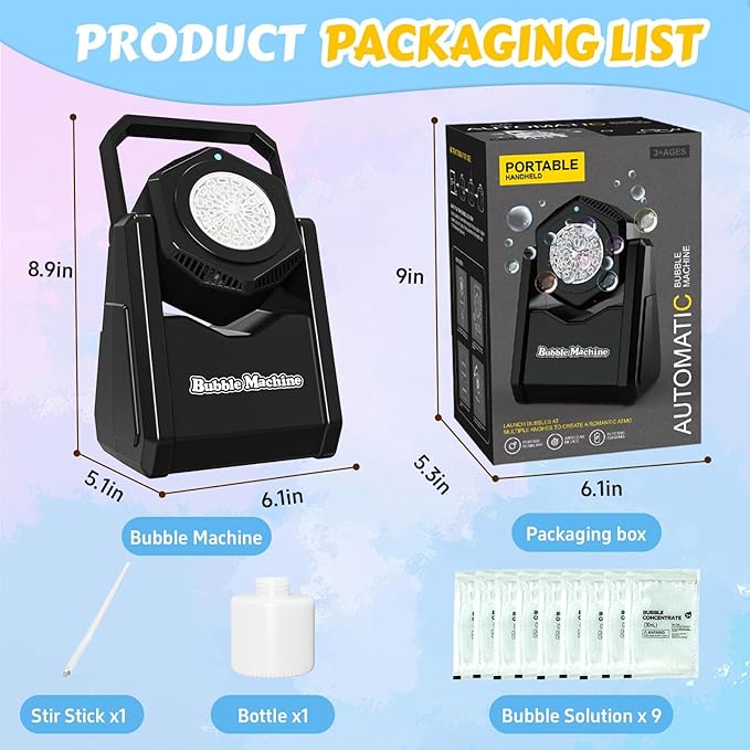 - Upgraded Bubble Maker with No Leakage Design Sufficient for Prolonged Use. Fully enclosed design whitout leakage problem, it won't stain your hands and mess everywhere. With 200ml high-capacity liquid tank for 30mins continuous use, enjoy uninterrupted bubbles fun! Also Comes with 9 packs bubble solution for bubble refill.