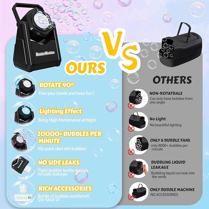 - 15 bubble wands and powerful wind designed for more bubble holes and faster speed, producing more bubbles for an improved satisfying experience.
