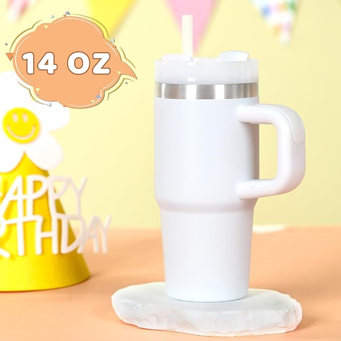 Cosictic 14 Oz Tumbler with Handle and Straw for Kids, Stainless Steel Double Wall Vacuum Insulated Cup for Children, 14 Oz Cups for Kids (Wihte)