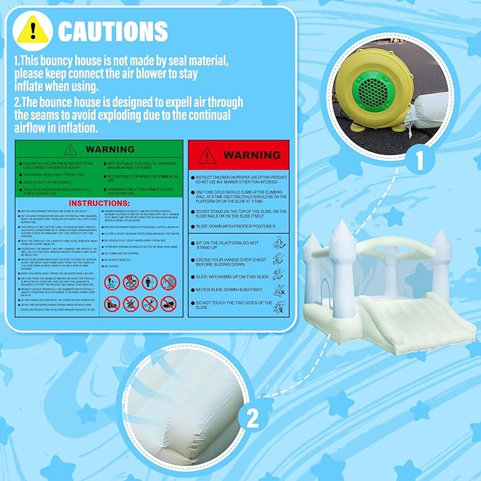 - Easy Setup: AKSPORT bouncy house comes with a powerful blower that inflates it in just 1-2 minute.This bounce house is portable and we come with a storage bag for easy indoor or outdoor use. This bouncy house is not made by seal material, please keep connect the air blower to stay inflate when using.