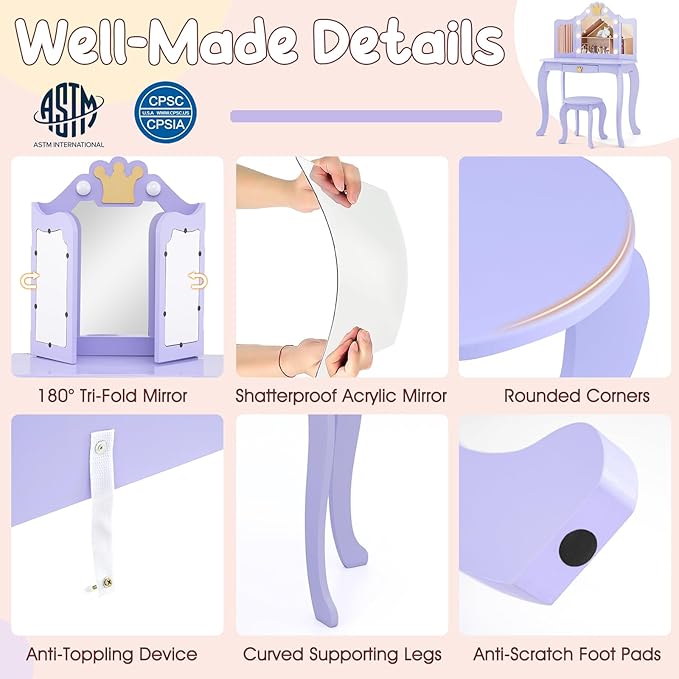 - Outstanding Stability & Safety: Designed with children's safety in mind, this kids vanity set is equipped with rounded corners, a shatterproof acrylic mirror, and an anti-toppling device, reducing the risk of accidents.
