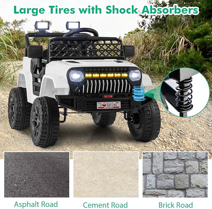 - 【Secure & Smooth Ride】 Equipped with an adjustable safety belt and lockable doors, the 12V ride on truck ensures your child’s safety. The soft start function prevents sudden accelerations scaring kids. With shock-absorbent tires, the car brings a comfortable riding experience on different surfaces, such as the asphalt road, cement road, and brick road.