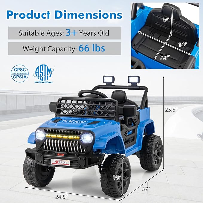 - 【Secure & Smooth Ride】 Equipped with an adjustable safety belt and lockable doors, the 12V ride on truck ensures your child’s safety. The soft start function prevents sudden accelerations scaring kids. With shock-absorbent tires, the car brings a comfortable riding experience on different surfaces, such as the asphalt road, cement road, and brick road.