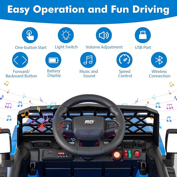- 【Multifunctional Console】 The dashboard of the ride on truck is designed for easy operation and fun driving. In addition to the integrated LED lights, tunable rearview mirrors, music and sound, the truck provides added entertainment with a USB port and wireless connectivity. The light switch, volume adjustment and speed control cater to varying needs.