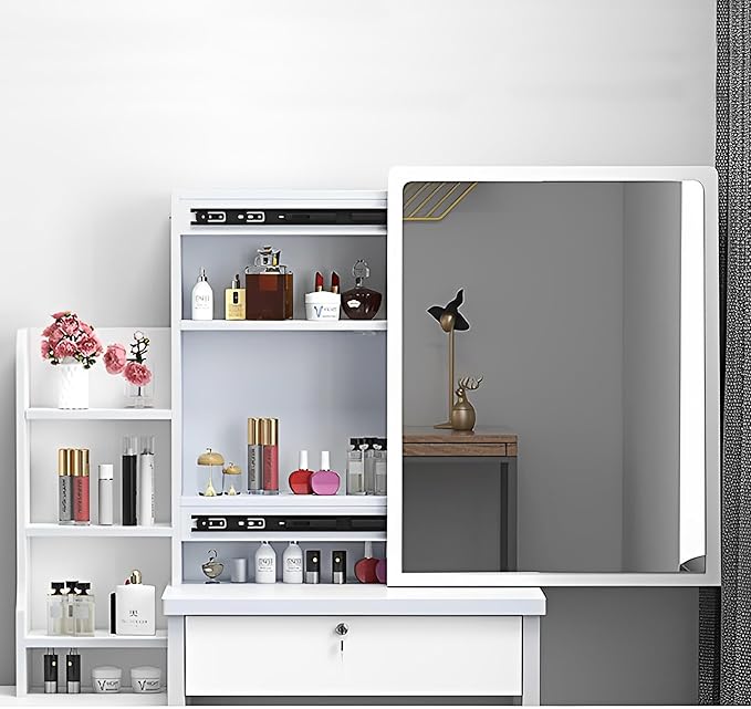 - White Vanity Desk with Drawers for a Tidy and Organized Beauty Space: Declutter your beauty area with our white vanity desk with drawers. This makeup vanity provides ample storage space with its spacious table top, multiple drawers, shelf, and side storage shelves. The sliding mirror glass door adds an elegant touch while keeping all your cosmetics and beauty essentials organized.