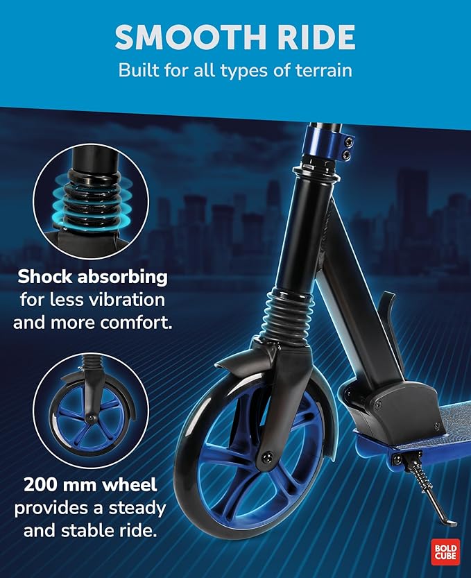 - FRONT WHEEL SHOCK ABSORPTION - With suspension fitted in the front wheel taking on uneven and bumpy surfaces couldn’t be more comfortable. Your BOLDCUBE children's and teen scooter's suspension absorbs as much of the shock as possible to minimise riding vibration.