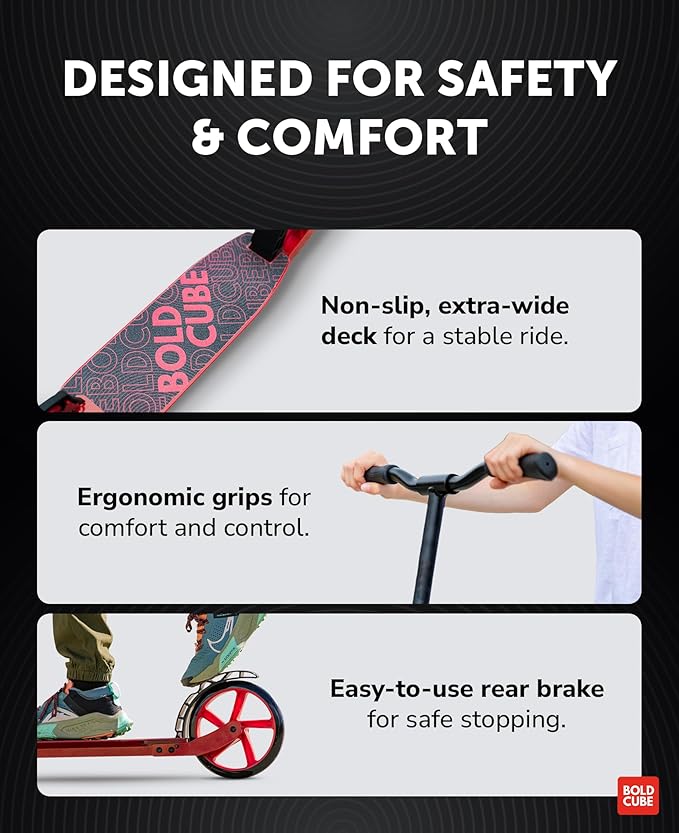 - FRONT WHEEL SHOCK ABSORPTION - With suspension fitted in the front wheel taking on uneven and bumpy surfaces couldn’t be more comfortable. Your BOLDCUBE children's and teen scooter's suspension absorbs as much of the shock as possible to minimise riding vibration.