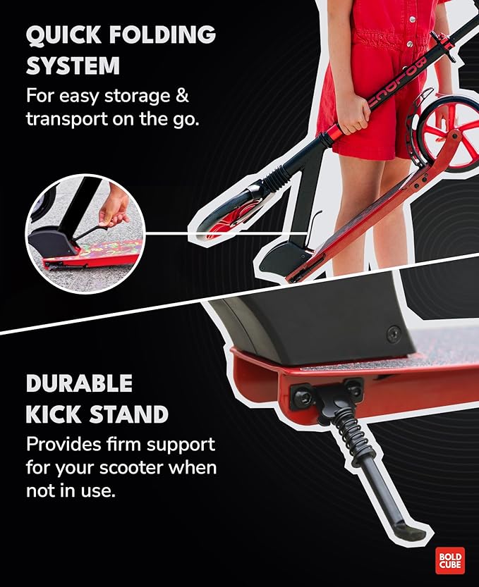 - FAST FOLD – The fast folding scooter lever offers quick and simple opening and closing of the kids scooter. Simply pull the lever down and your big two wheel scooter will fold / unfold. When you’re ready to store the scooter away the handlebars also fold down for more compact carry or storage size.