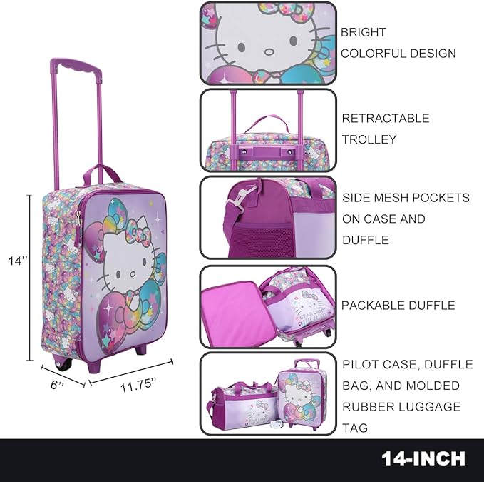 Bioworld Hello Kitty Starshine 3-Piece Youth Pilot Case Duffle Bag & Luggage Tag Carry On Luggage