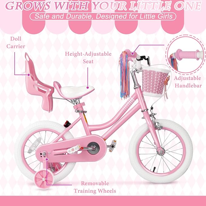 - 【CUTE COMPONENTS】Lovely colors and details, dual brakes (foot and hand), removable height-adjustable wider training wheels for more stable riding, bell and basket for dolls