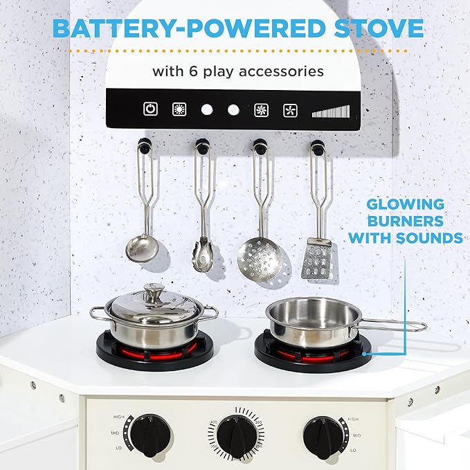 - TRUE-TO-LIFE KITCHEN: This includes a built-in play microwave and oven with clicking knobs, a light-up hood that mimics authentic sounds, and a battery-powered ice dispenser and stove for an immersive, interactive experience