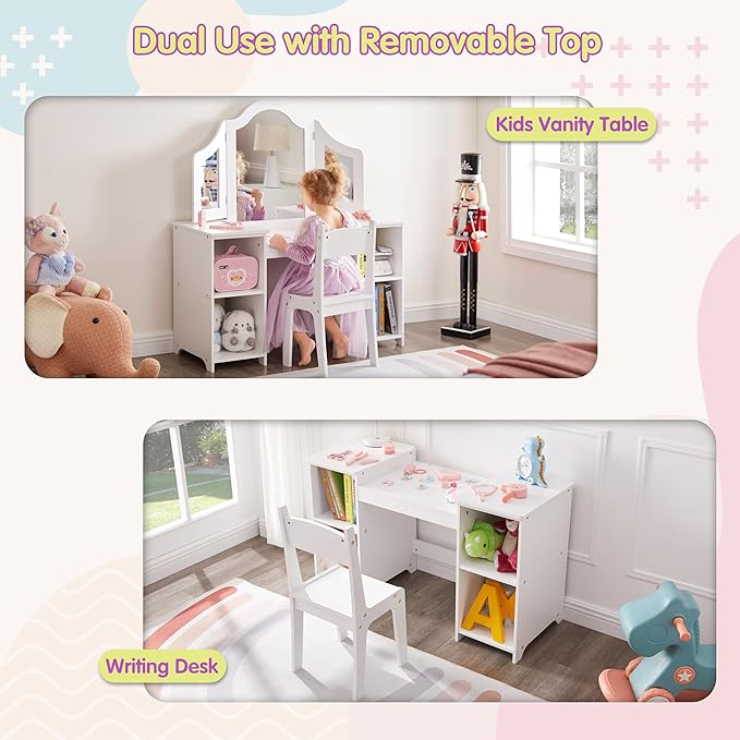 - 【Multifunctional & Safe Design】 The tri-fold mirror clearly reflects the cute faces of little girls, allowing children to observe their makeup and hair in all directions. The trifold mirror of the girls vanity set is removable so that your child can use it as a writing or reading desk if necessary. In addition, the table is anti-tipping and can be fixed to the wall for added security.