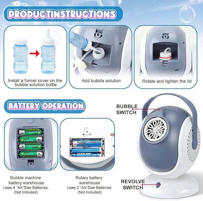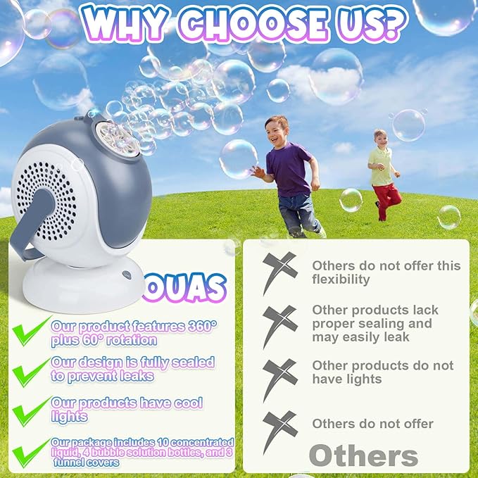 - 360° Rotating Bubble Coverage: Create a bubble wonderland with 60° or 360° swing angles for wide and dynamic coverage. Perfect for adding excitement to birthdays, weddings, parties, or casual playtime