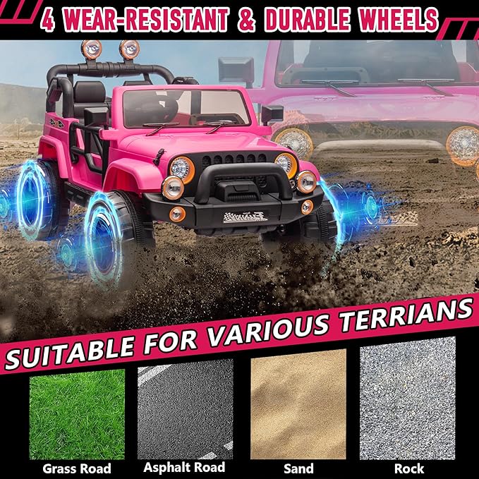 - Smooth Off-Road Adventure: Equipped with 2WD and rear suspension, this kids' ride-on car is built for outdoor play across grass, gravel, or sidewalks. The 80Wx2 motor provides a smooth 2.5-4 MPH range, offering a thrilling yet safe driving experience for big kids who love adventure