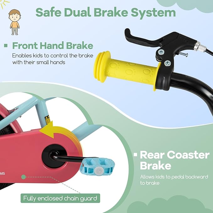 - [ Comes with A Dual Brake System ]: The front hand brake enables kids to control the brake with their small hands. The rear coaster brake allows kids to pedal backward to brake conveniently. Moreover, there is a fully enclosed chain guard to prevent kid's feet from getting pinched, ensuring higher safety.