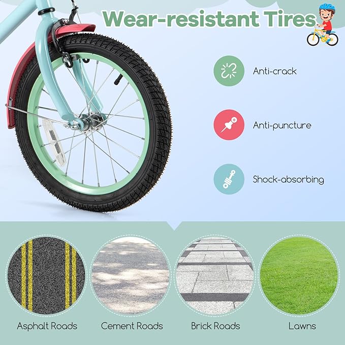 - [ Smooth & Safe Riding Experience ]: The anti-crack and wear-resistant tires ensure a smooth and steady ride on asphalt roads, cement roads, brick roads, and lawns. 2 detachable training wheels help beginners keep balance and pedal independently. The front and rear reflectors included in 16" & 18" bikes take an important role to keep kids visible when they ride at night.
