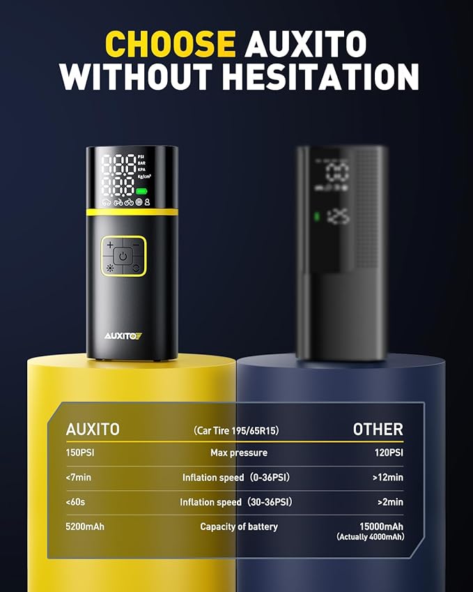 - 【Fast Inflation in Just 1 Min】 AUXITO Tire Inflator delivers 150 PSI max pressure and a powerful 26L/min airflow, inflating tires 3x faster than standard pumps. Perfect for busy drivers, it inflates compact car tires (from 30 to 35 PSI) in just 1 minute—saving you time and hassle on the road