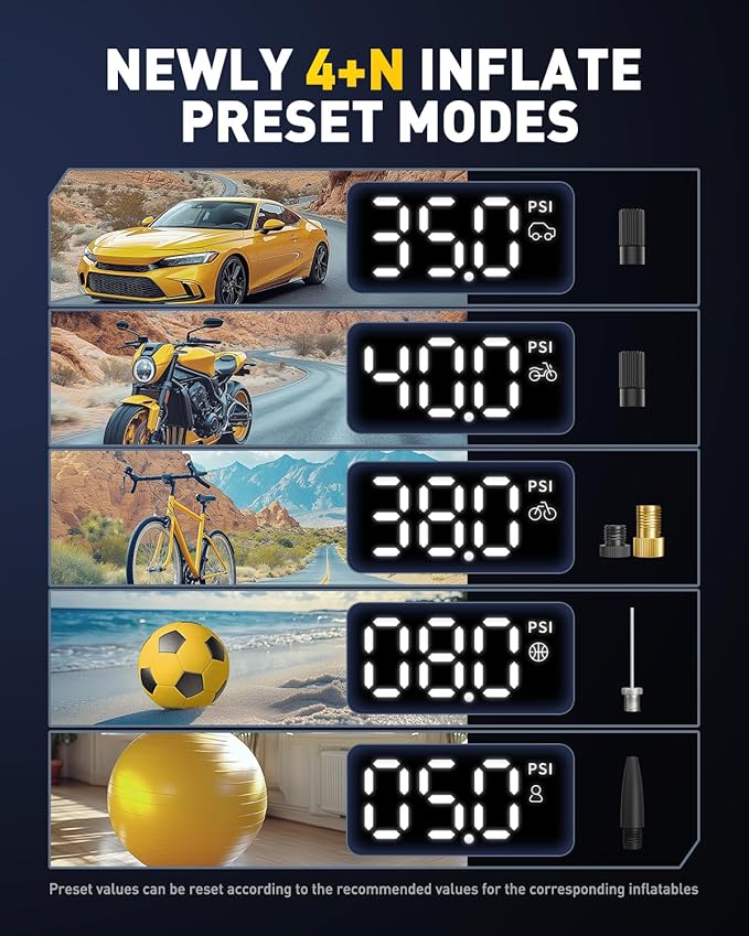 - 【4+N Smart Preset Modes for Any Task】 AUXITO Tire Inflator Portable Air Compressor with 4 preset modes (Car, Motorcycle, Bike, Ball) and a Custom mode, this inflator handles any inflation task effortlessly. Whether you're filling car tires, bike tires, sports equipment, or even pool toys, the AUXITO Tire Inflator is your ultimate all-in-one solution