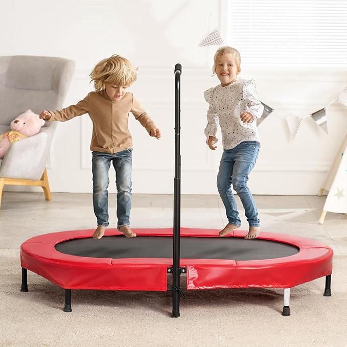- 5 Adjustable Heights: The adjustable handle design allows for height settings ranging from 38 inch to 45 inch, suitable for kids aged 3-12. This indoor outdoor toddler trampoline can effectively releases children's natural energy, making it the best family activity game. It can be installed indoors, outdoors, in the garden, or in the backyard.