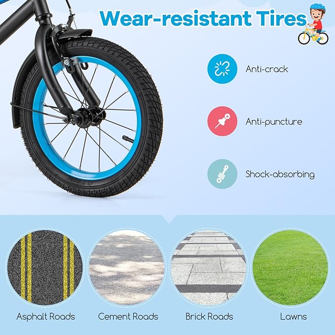- [ Smooth & Safe Riding Experience ]: The anti-crack and wear-resistant tires ensure a smooth and steady ride on asphalt roads, cement roads, brick roads, and lawns. 2 detachable training wheels help beginners keep balance and pedal independently. The front and rear reflectors included in 16" & 18" bikes take an important role to keep kids visible when they ride at night.