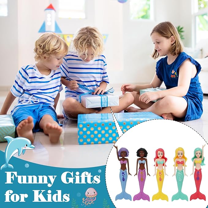 - Package Includes: Set of 10 vibrant diving mermaids, each standing 5.5 inches tall. With a delightful assortment of colors and charming designs that kids love, these toys will make bath time or pool play even more exciting