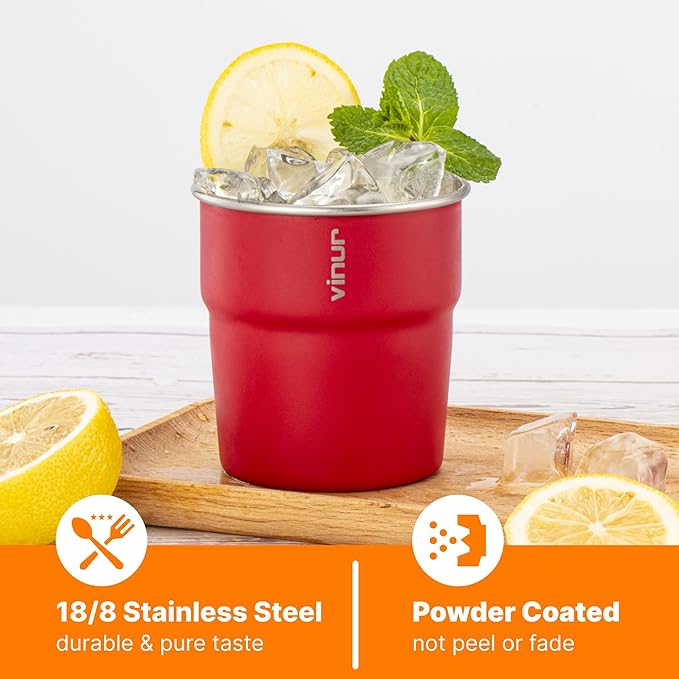 VINUR Kids Stainless Steel Cups-8 oz Stackable Tumbler Metal Drinking Glasses for Travel, Camping, Outdoors, 4 Pack (Royal Blue-Canyon Red-Black-Purple Pink)