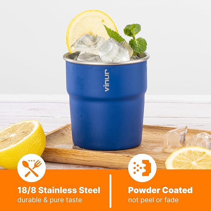 VINUR 8 oz Stainless Steel Cups Tumbler Stackable Metal Drinking Glasses for Travel, Camping, Outdoors, 4 Pack (Baby Blue-Navy-Teal-Purple)