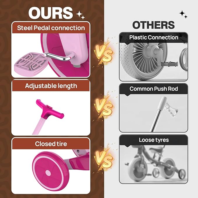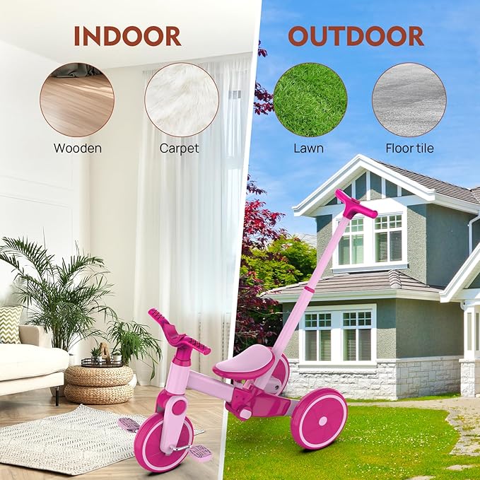- 【MULTI-MODES TRICYCLE】This tricycle is the perfect companion for your child's journey from exploring their surroundings to independent walking, effortless sliding, and eventually mastering riding. Simply press the button to remove the pedals and switch the back wheels to the desired mode.
