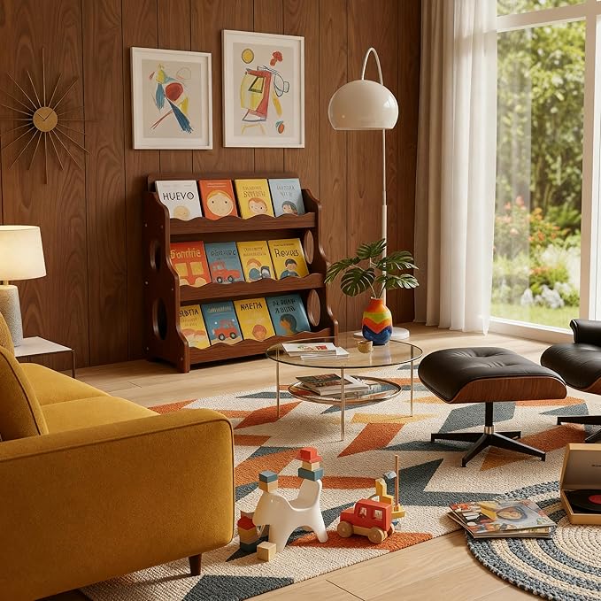 Kids Bookshelf Wooden Montessori Book Shelf Dutch Design 3Tier Scalloped,WalnutWood Pattern