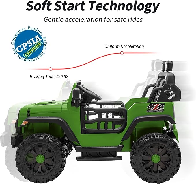 - High Security: Designed for safety, this ride on car features a 16mm solid steel axle and a 150 lb weight capacity for superior durability. The soft-start system ensures smooth, controlled acceleration for a safer ride.