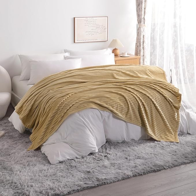 NTBAY Plush Flannel Twin Bed Blanket, 60x80 Inches Soft and Warm Lightweight Blanket with Striped Texture for Couch, Sofa, All Seasons, Khaki