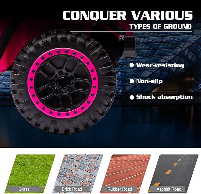 - 【Powerful 24V Off-Road Performance】This Power Wheels kids' electric equipped with a 24V battery and 2 powerful motors. Four-wheel suspension system design effortlessly conquers various terrains such as grass, gravel, asphalt, brick roads, and wooden planks. The rear shock absorbers ensure smooth operation at a maximum speed of 3.7 miles per hour.