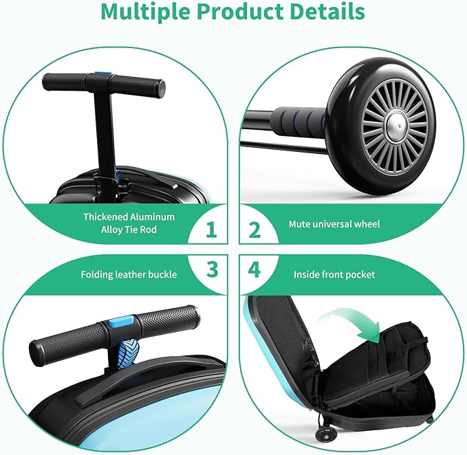 - 【Safe and Fun Riding Experience】The scooter luggage features a unique dual-wheel design at the front to ensure balance while riding. For added safety, there's a responsive brake pedal located at the end of the base, allowing kids to stop instantly with just one press of their foot. The PU material wheels provide smooth and quiet rides, enhancing both safety and enjoyment for young travelers.